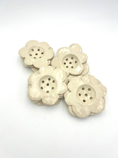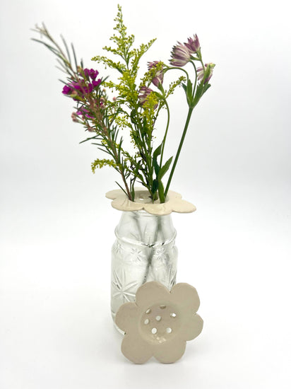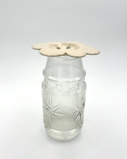 This flower frog uses a white clay body dressed in either clear, pink or yellow glaze. It can fit in the mouth of a standard mason Jar, and has 1/4" holes to separate your flowers from each other.