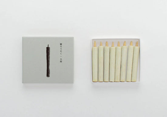 Hand-made, genuine Japanese candles with 100% natural sumac (HAZE) wax. They burn stably and beautifully with a larger flame than the conventional western candles. As only natural ingredients are used, they create less soot and odor when extinguished.