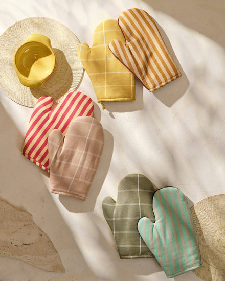 MINNA’s new oven mitts are double-sided, making them a uniquely versatile addition to our kitchen textile collection. Inspired by Sol Lewitt's Wall Drawings, they are perfect for mixing and matching and bring a playful pop to your kitchen color story. Stylish yet pliable and durable, our oven mitts are equally attractive in use or hanging in your kitchen by the attached loop.